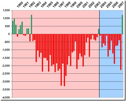 Continuing population decline every quarter, save for a few. The cause of the declines in the 1990s was undoubtedly the combined impact of the cod moratorium and the relative weakness of the rest of the provincial economy.