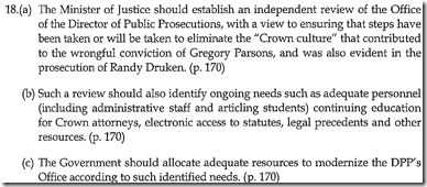 Establishing an independent review of the Office of the Director of Public Prosecutions is one of the recommendations Minister [Tom] Marshall [no relation to Bill] said government will implement immediately. Commissioner Lamer recommends that an independent review be called to ensure that steps have been taken or will be taken to eliminate the "Crown culture" that contributed to the wrongful conviction of Gregory Parsons, and was also evident in the prosecution of Randy Druken.