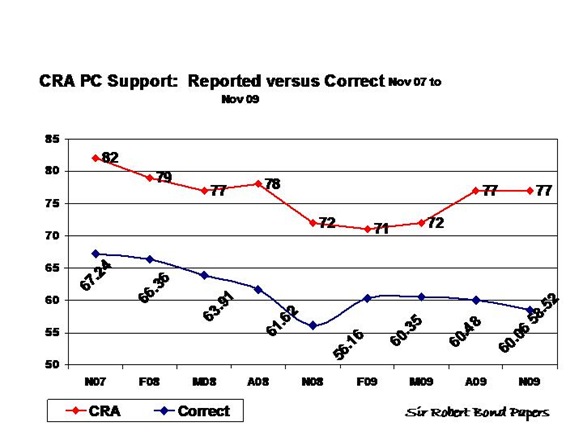 4. Hide the trends. Reporting results as a share of decideds masks the real trends, or, as in the past three quarter gives the wrong trends. Tory support isn’t up and stable, as suggested by the CRA torqued version. CRA’s own numbers - presented more accurately - show support for the Tories going down.