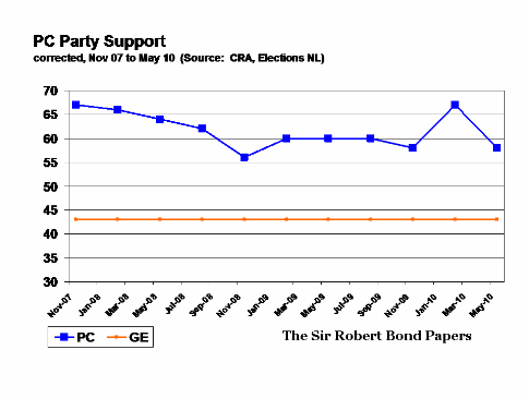 Even allowing for problems with CRA’s polling, and for the government’s organized poll goosing efforts, that’s the largest quarterly drop CRA has reported for the Williams Tories since early 2005.