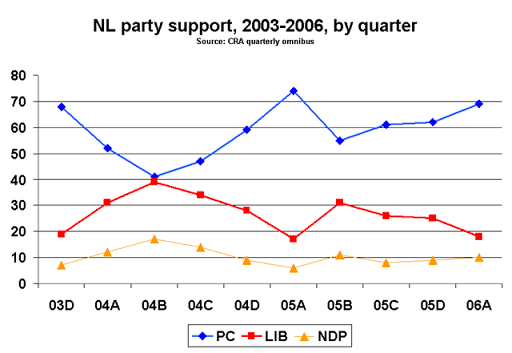 Down the Conservatives went in the polls. Those are the quarterly CRA numbers in the chart, above Out came the war with Ottawa to boost them back up again, and then in 2005 spring budget, the Conservatives opened up the spending taps. The only thing the Conservatives couldn’t find money for in the 2005 budget was a cancer centre in a district represented by a Liberal member of the House of Assembly.